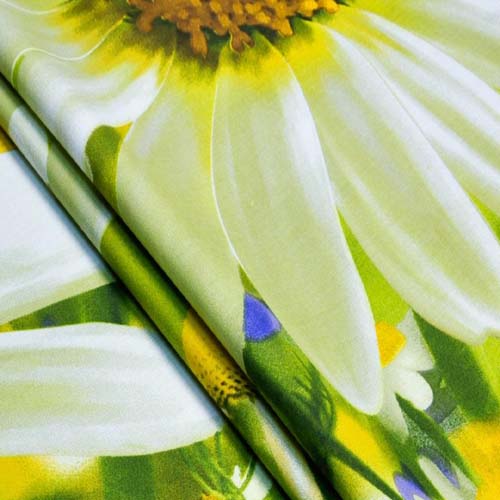 Бязь принт Gold Lux - ромашки. Длина рулона 50 метров, ширина ткани - 2,2 м. Плотность 125 г/м2. Состав: хлопок + полиэстер. Производство - Пакистан.