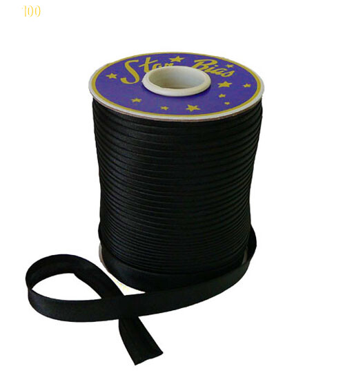 Косая бейка (атласная) - цвет черный. Ширина 15 мм, 105 м длина. Производство Китай. Оптовая цена действует при заказе от 10 бобин одного цвета.