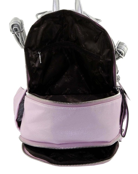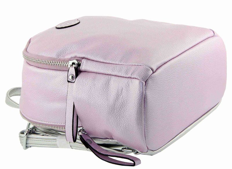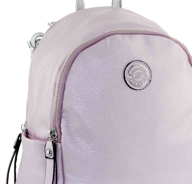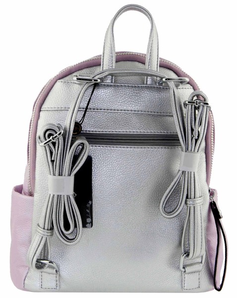 Красивый и удобный рюкзак-трансформер изготовлен из кожзама отличного качества цвета нежно-ультрарозового с перламутровым оттенком, спинка серебристого цвнта. Заплечные ремни свободно регулируются по длине и трансформируются в длинный ремень через плечо. Рюкзак состоит из двух больших автономных отделений, закрывающихся молниями. Сумка-рюкзак отлично держит форму. Благодаря необычному цвету, который сочетает в себе разные оттенки, подойдет под множество нарядов в гардеробе своей хозяйки.