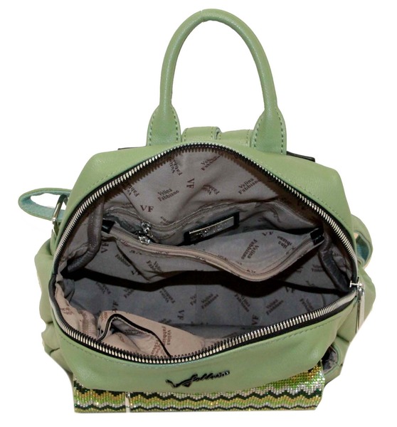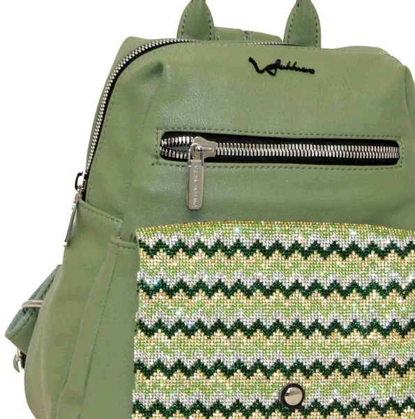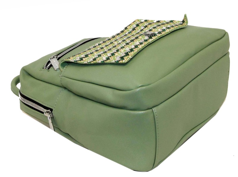 Яркий и стильный зеленый рюкзак подойдет для ежедневного использования в условиях города тем, кто предпочитает свободный стиль или стиль casual. Широкие лямки делают его комфортным аксессуаром даже для продолжительных прогулок. Модель очень вместительна и имеет внутренние карманы и один большой накладной фронтальный карман. Изюминка модели — закрывающий клапан, украшенный узором из разноцветного бисера.