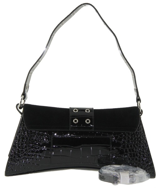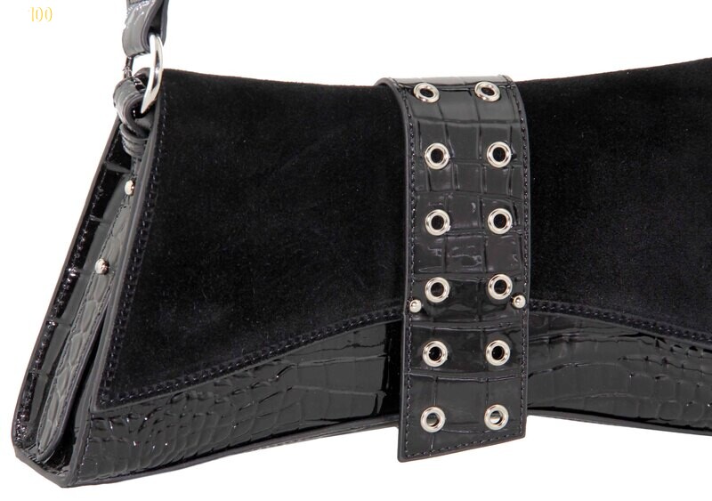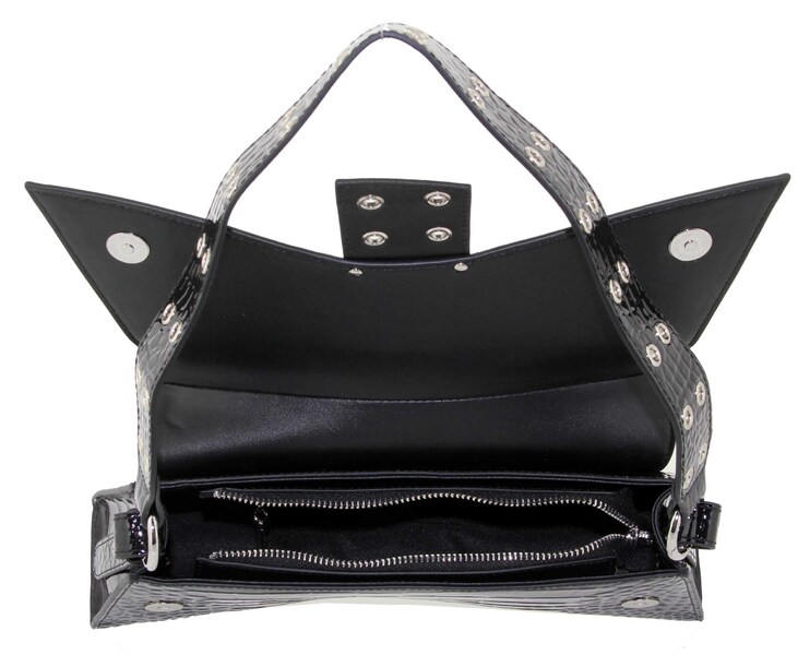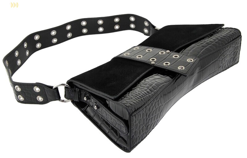 Сумка багет кожаная лак с замшей с клапаном Polina & Eiterou W 1006-1j, Цвет черный, размеры , 31 см x 16 см x 6 см